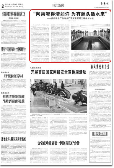 根據(jù)地委、行署的統(tǒng)一部署,項(xiàng)目總投資1.93億元,日供水量3萬(wàn)立方米,于2013年7月4日正式開(kāi)工建設(shè),建設(shè)凈水廠1座,配套建設(shè)取水壩及120米管架橋1座,取水、輸水管道總廠39023米,配水管網(wǎng)總廠22140米。修建綜合辦公樓1座,水處理車(chē)間1座,以及變配電間、反沖洗泵房、加氯加藥間、絮凝平流池、V型過(guò)濾池、清水池、門(mén)衛(wèi)室大門(mén)圍墻、附屬設(shè)施等工程,于2014年7月20日完成所有建設(shè)內(nèi)容,并正式通水運(yùn)行。