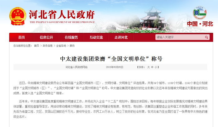 河北省人民政府網(wǎng)站報道了中太建設(shè)集團(tuán)榮膺“全國文明單位”稱號