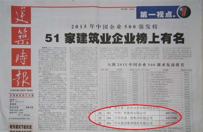 建筑時報8月27日報道了中太建設集團入圍2015年中國企業500強,在入圍的建筑承包商中排名第26位