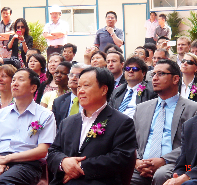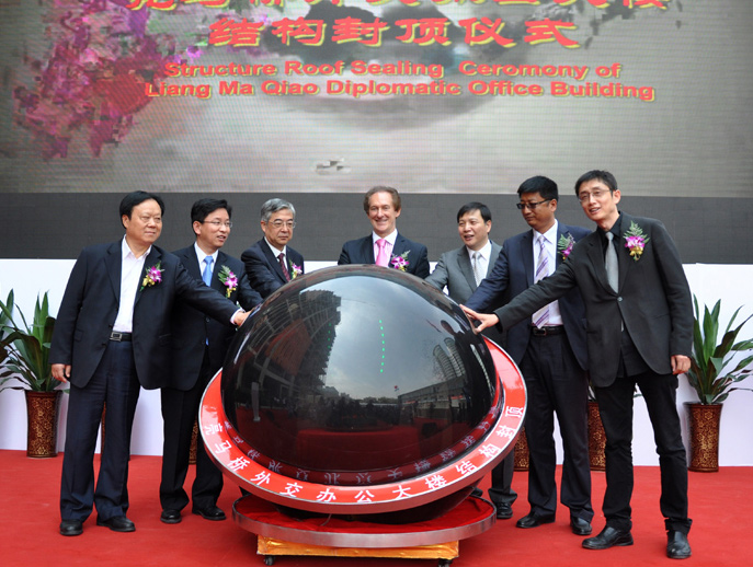 2013年5月15日上午,伴隨著最后一方混凝土的成功澆注,在50余名駐華外交使節(jié)以及外交部、北京市等有關(guān)部門代表的見證下,由集團公司第八工程局承建的亮馬橋外交辦公大樓工程正式實現(xiàn)主體結(jié)構(gòu)封頂。董事局主席李文健(左一)應(yīng)邀出席儀式。