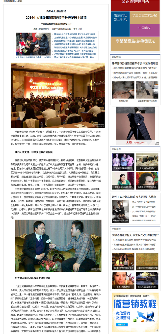 陜西傳媒網(wǎng)2014年01月05日?qǐng)?bào)道了2014中太建設(shè)集團(tuán)唱響轉(zhuǎn)型升級(jí)發(fā)展主旋律