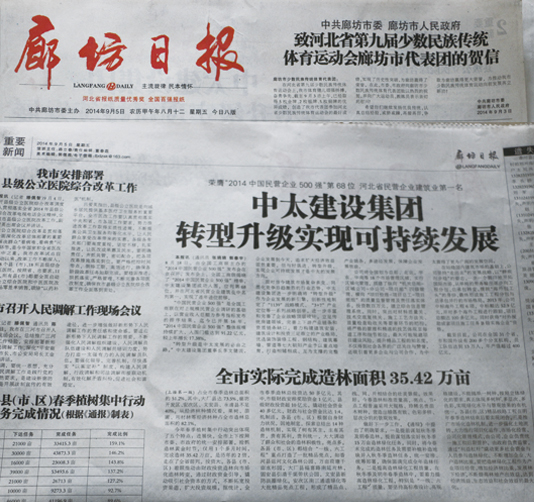 9月5日廊坊日報報道了中太建設(shè)集團轉(zhuǎn)型升級實現(xiàn)可持續(xù)發(fā)展