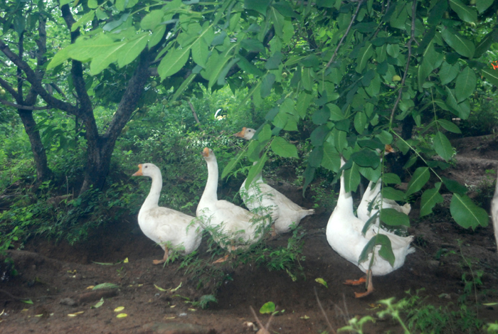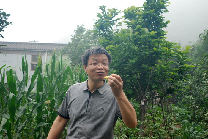據第八工程局工作人員介紹,此采摘處約有20畝果樹林地。山上種植著杏兒、桃兒和核桃。山下院內菜園里,種植著施用農家肥的各類時蔬和植物。以蟲兒、草兒為食、自由散養的雞鴨悠閑漫步在山林中,好一派恬靜如詩、優美如畫的田園風光。