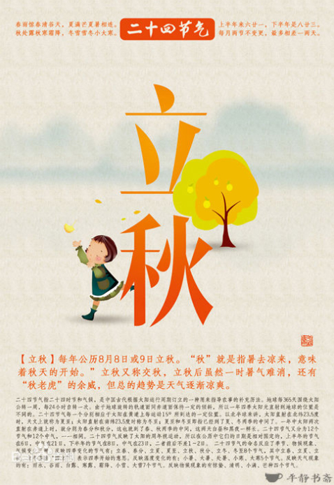 今天是立秋,意味著夏季的結(jié)束,秋季的開始,氣溫逐漸下降,雨水逐漸減少。我國(guó)幅員遼闊,就節(jié)氣而言不可能同時(shí)進(jìn)入涼爽的秋季的,是有一些差別的。生活在廊坊這個(gè)地方,四季分明的氣候,是老天恩賜的福分。不冷不熱的天,氣候宜人,真正是秋高氣爽。我國(guó)古代將秋季劃分為三候:一候涼風(fēng)至,二候白露生,三候寒蟬鳴。是說立秋后刮風(fēng)人們會(huì)感到?jīng)鏊蟮卦绯繒?huì)有霧氣產(chǎn)生,并且秋天感陰而鳴的寒蟬也開始鳴叫。民間流行“貼秋膘”,就是在立秋這天吃些美味佳肴,老百姓家就是燉肉、包餃子。